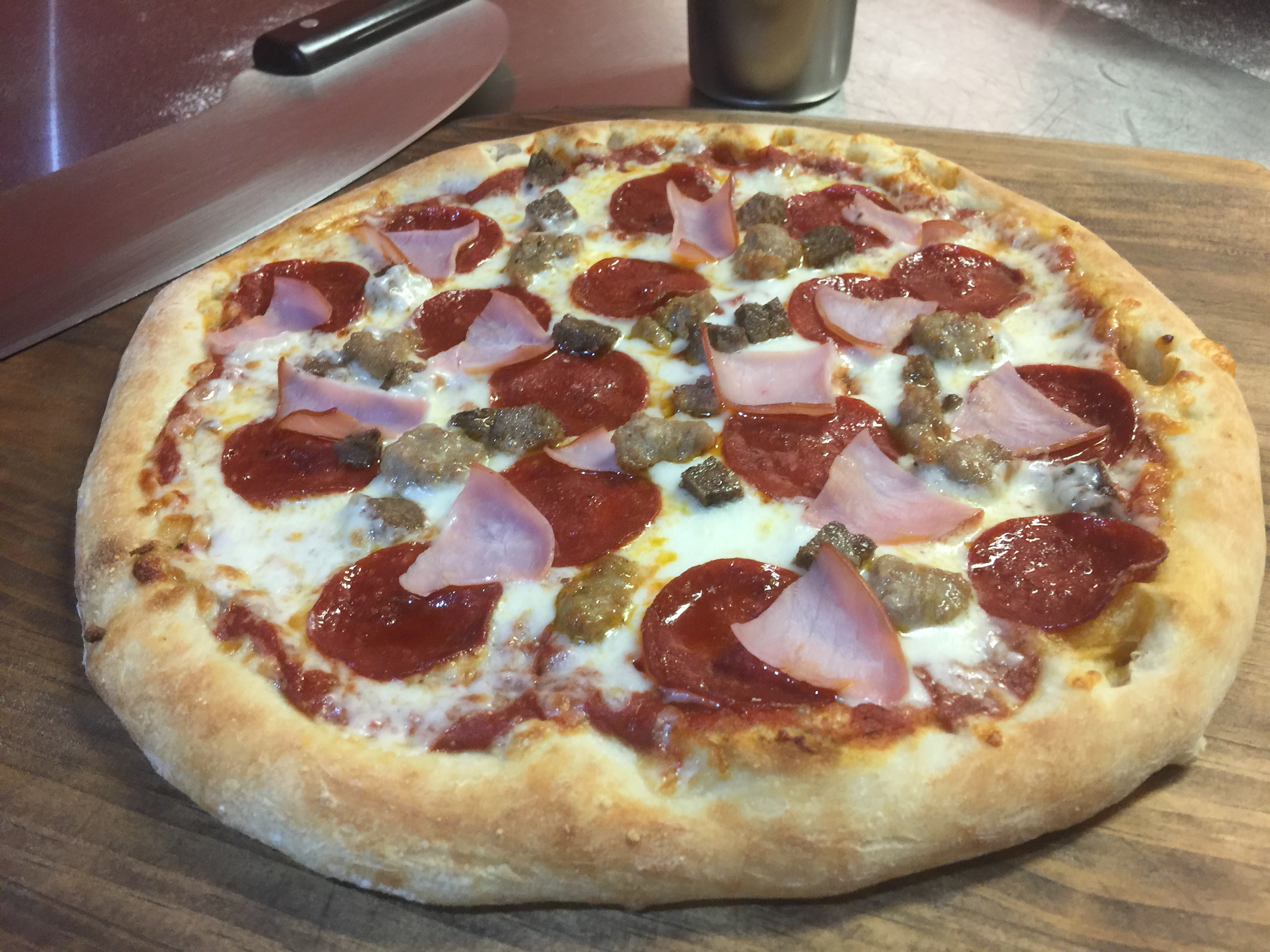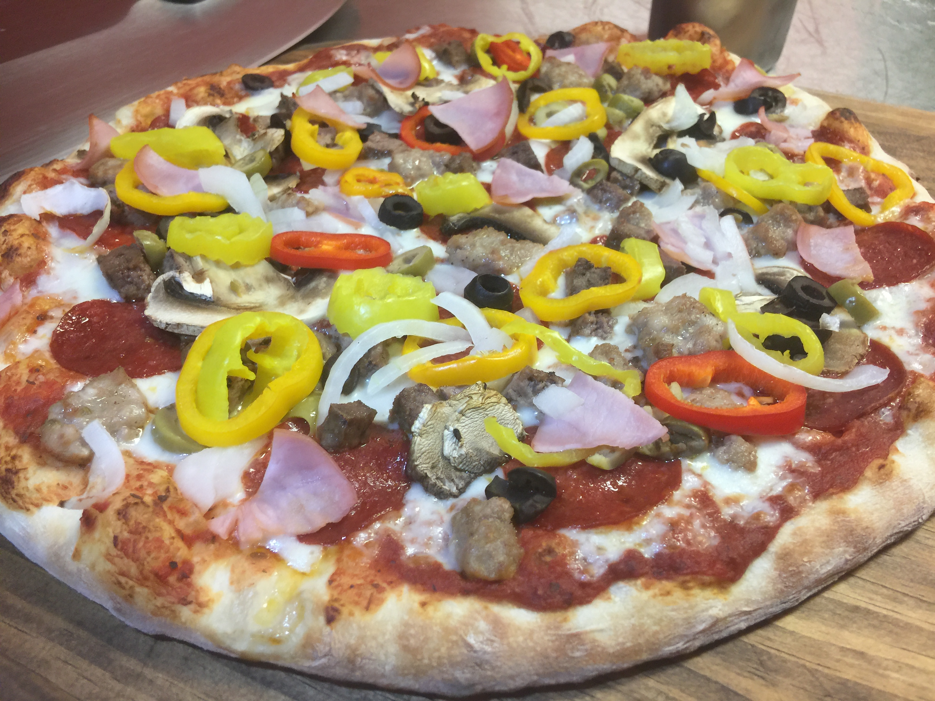 The Sink- Drive-In Burger, Pepperoni, Italian Sausage, Canadian Bacon, Green/Black Olives, Onion, Mushrooms, Sweet/Banana Peppers