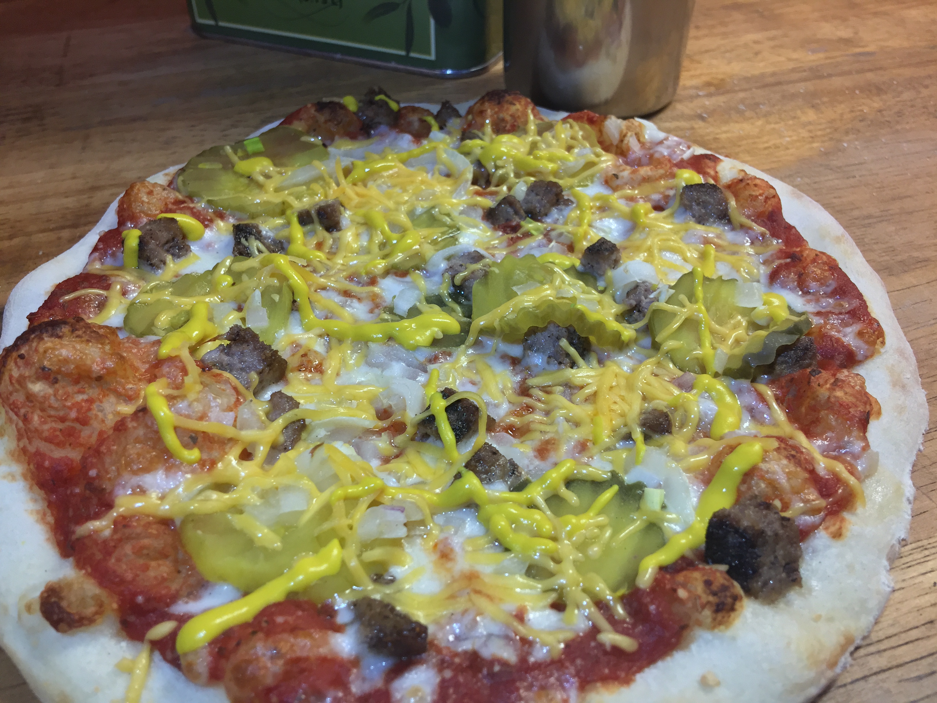 Showburger Pizza - Drive-In Burger, Onion, Pickles, Cheddar Cheese, & drizzled with Mustard