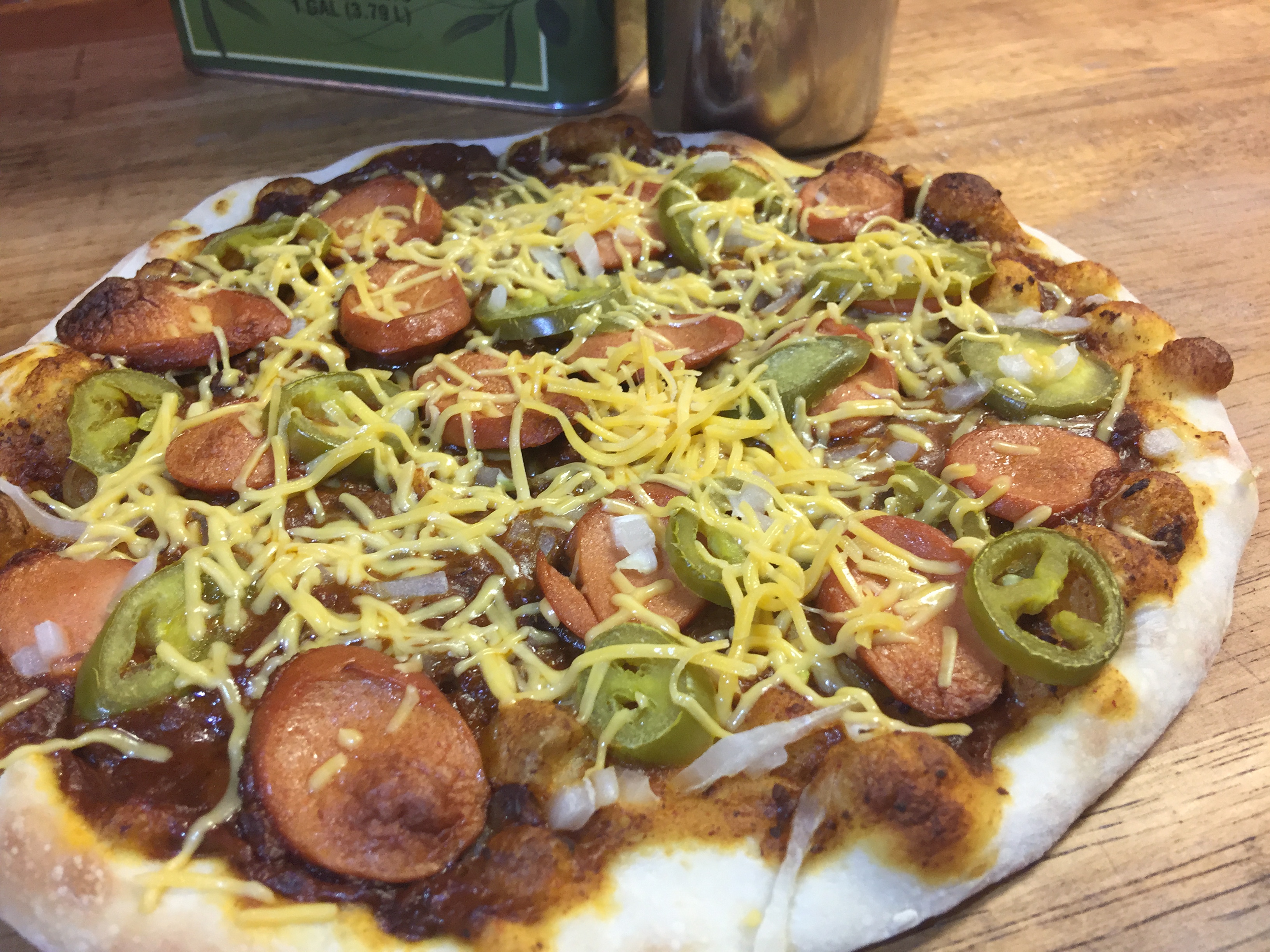 Chili Dog Pizza - Chili, Hot Dog Slices, Jalapenos, Onions & Cheddar Cheese
